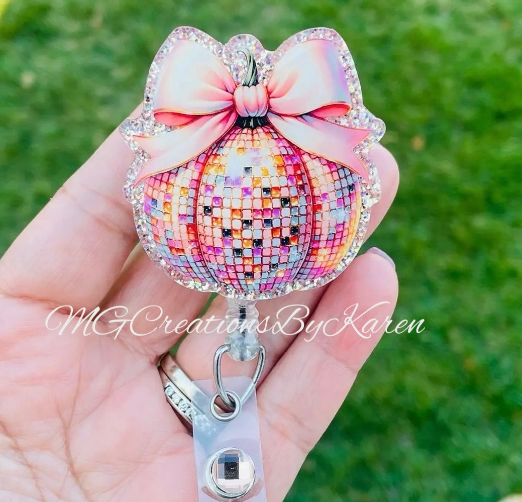 Fall Disco ball pumpkin clear acrylic blanks for badge reels with matching vinyl decal, acrylic blank, decal, vinyl decal, Pumpkin, Fall disco ball acrylic blank